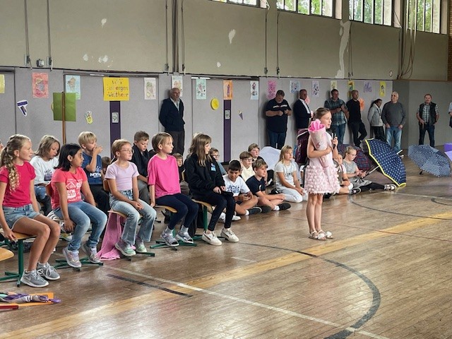 Die Einschulung begann an beiden Standorten mit einem feierlichen Gottesdienst im Dorf für die Erstklässler und Eltern, um den Kindern Gottes Segen mit auf dem Weg zu schicken. Im Anschluss fand in den Turnhallen eine Einschulungsfeier statt, wo Angehörige der Kinder zusammenkamen, um diesen besonderen Moment zu feiern. Die Schülerinnen und Schüler der vierten Klassen hatten ein besonderes Programm vorbereitet, um die Neulinge herzlich willkommen zu heißen. Die 4a und 4b in Eisbergen spielten das Theaterstück , die 4c in Veltheim führte das Kindermusical "Schulmonster gibt's doch gar nicht" auf. Mit anschaulicher Kulisse (ein riesen Tornister, verschiedene Plakate), die von den Kindern gestaltet waren, wurde gespielt, gesungen und getanzt. Die Atmosphäre war freundlich und einladend, die Aufregung der neuen Kinder und Eltern war deutlich spürbar. Nach der Feier durften die Erstklässler zum ersten Mal mit ihrer Klassenlehrerin, Frau Münstermann in Eisbergen und Frau Edler in Veltheim, in die eigene Klasse gehen und sich gegenseitig kennen lernen.